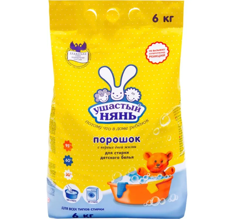 Стиральный порошок Ушастый Нянь детский 6 кг для стирки детского белья предназначен для стирки детских изделий, в том числе новорождённых, из хлопчатобумажных, льняных, синтетических тканей, а также тканей из смешанных волокон (кроме изделий из натурального шёлка и шерсти), вручную, в автоматических стиральных машинах и в машинах активаторного типа. Содержит добавки для смягчения воды и антикоррозийной защиты. Разработан специально для стирки белья и одежды детей любого возраста, в том числе новорождённых. Подходит для стирки одежды людей с чувствительной кожей. Отлично отстирывает с пелёнок, ползунков, нагрудников и других детских вещей самые сложные загрязнения - пятна от молока, яиц, фруктовых пюре, соков, каш, а также продуктов жизнедеятельности малышей. Действует уже в процессе замачивания и позволяет добиться безупречного результата стирки даже в воде низкой температуры - не нужно кипятить и застирывать вещи. Не повреждает структуру волокон тканей, поэтому одежда малыша будет выглядеть как новая даже после многократных стирок. Не содержит мыла, поэтому легко выполаскивается из ткани, что исключает попадание на кожу ребёнка моющих веществ. Легкий цветочно-фруктовый аромат порошка сделает стирку приятной, но не останется на белье.Меры предосторожности:при попадании на кожу может вызывать раздражение. При возникновении симптомов раздражения кожи и в случае попадания средства в глаза немедленно промыть проточной водой и обратиться за медицинской помощью. При повышенной чувствительности и повреждениях кожи избегать длительного контакта с моющим раствором для стирки и использовать средства индивидуальной защиты (перчатки). Беречь от детей. Хранить вдали от пищевых продуктов. Избегать попадания в окружающую среду. После полного использования средства упаковку утилизировать как бытовой мусор.Условия хранения: хранить в крытых сухих вентилируемых складских помещениях, защищенных от воздействия прямых солнечных лучей нарасстоянии не менее 1м от нагревательных приборов, при температуре не выше +35°C и относительной влажности воздуха не более 95%. Срок годности: 3 года