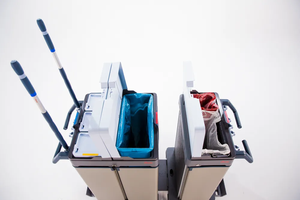 - Комплектация 3 ведра с крышками и с цветовым кодированием (синий), 2 контейнера для мопов с крышками и цветовым кодированием (синий), 2 мини-контейнера, 1 чехол для сбора мусора и мопов с разделением на 2 секции, 3 дополнительные клипсы цветового кодирования (красные)