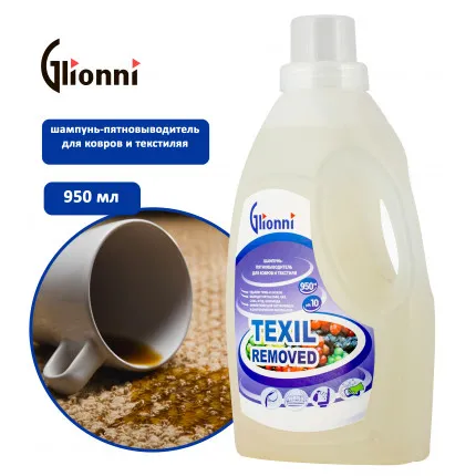Высокоэффективный шампуньTEXIL REMOVED для удаления загрязнений с ковровых покрытий и обивки мягкой мебели.