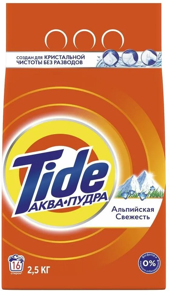 Стиральный порошок автомат Tide Альпийская свежесть для стиральной машины предназначен для стирки белого и цветного белья. Tide Альпийская свежесть удаляет трудновыводимые пятна и возвращает вещам кристальную чистоту с первой стирки, включая сложные зоны, такие как воротнички, манжеты и область подмышек.