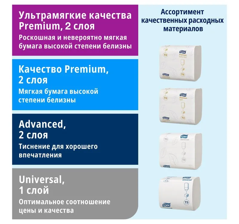 Закрытый диспенсер системы Т3 также помогает поддерживать уровень гигиены — пользователь прикасается только к листу, который берет. Tork листовая туалетная бумага обладает хорошим соотношением цены и качества.
