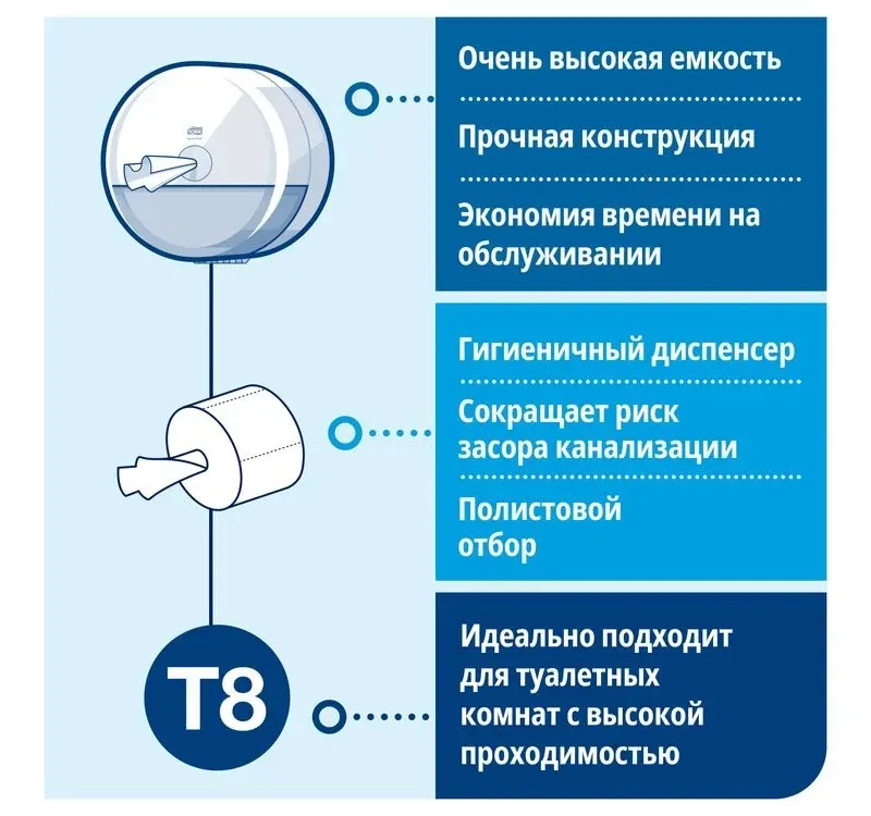 Большая емкость: меньше перезаправок, бумага не закончится неожиданно, Гигиенично: контакт только с тем листом, который используется.