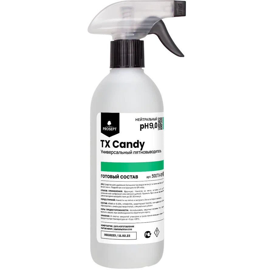 TX Candy — это профессиональный нейтральный пятновыводитель, который эффективно удаляет большинство типов пятен, включая танинные, не повреждая и не обесцвечивая ткань. В его основе лежит комплекс растворителей, которые обеспечивают высокую эффективность в борьбе с пятнами.