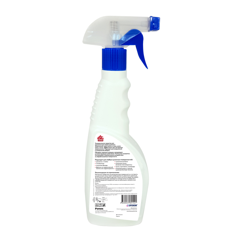 Универсальное средство для удаления всех видов кухонных загрязнений: жир, копоть и сажа, налет, грязь и пыль. Эффективно при застарелых загрязнениях. Подходит для ежедневной и генеральной уборки.