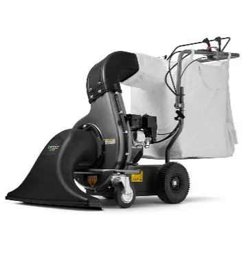 Самоходный садовый пылесос оснащен задними пневматическими колесами с агрессивным протектором, позволяющим легко перемещаться по газону.