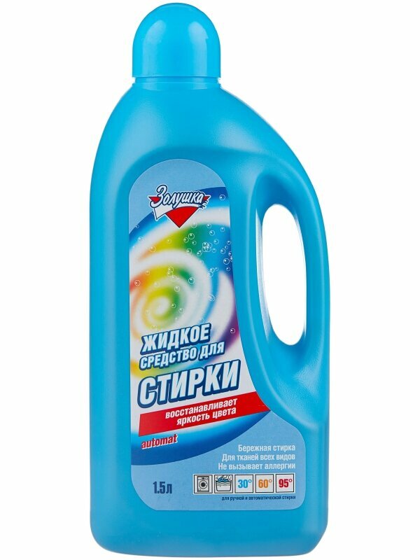 Универсальное средство для стирки Золушка — это гелеобразное жидкое средство, предназначено для стирки тканей всех типов, цветного, черного и белого белья.