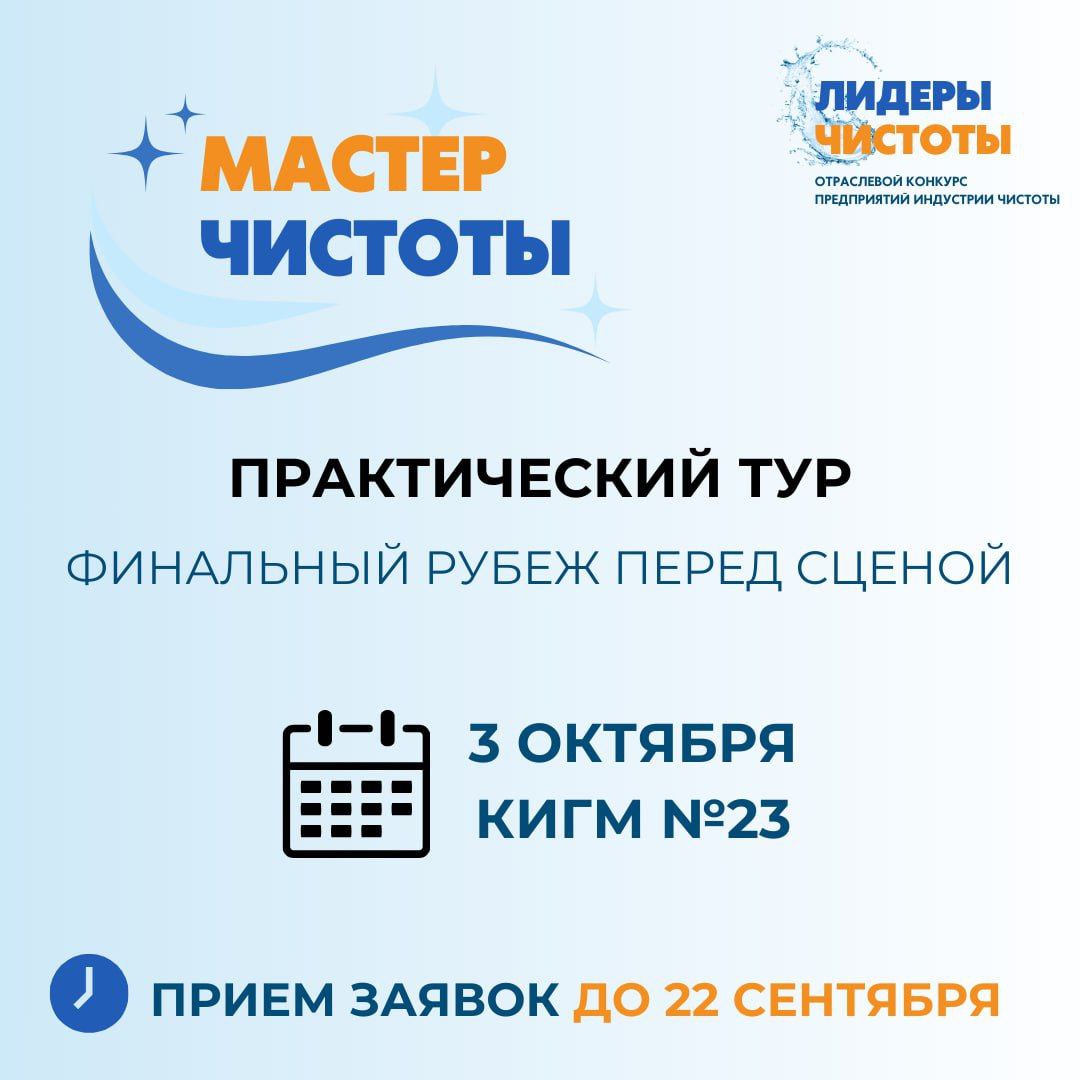 3 октября на базе КИГМ №23 мы проведём награждение победителей второго тура конкурса «Лидеры Чистоты» и практический этап номинации «Мастер Чистоты». Это тот самый день, когда решается, кто выйдет на сцену финала в ноябре на CleanExpo.